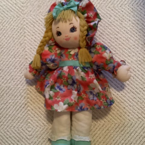 Molla Maija pehmolelu nukke, jossa vaaleanpunainen vauvanasu ja vaaleat yksityiskohdat. Nukella on siniset silmät ja pehmeä materiaali, soveltuu lasten leikkeihin.