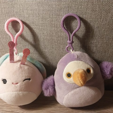 Kaksi suloisen pehmeää Squishmallows klipsipehmoa, koko noin 9 cm. Kiinnitä vaikka reppuun.