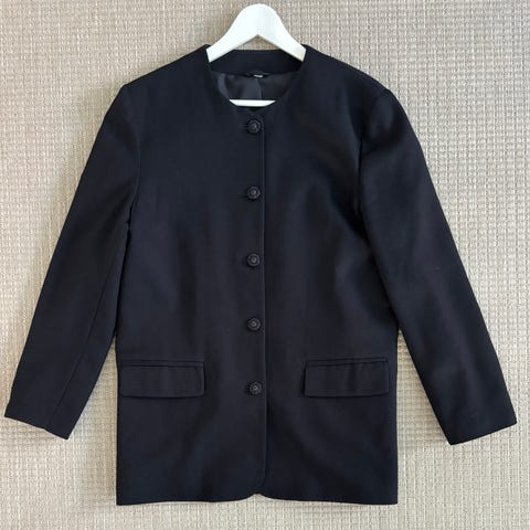 Harvinainen, villa blazer, mustat tereet somisteena ja kullanväriset napit. Sisältä siisti, ei kulumista. Upea kontrasti ja värien loisto kuvioinnilla. Yhdistettävissä monenlaiseen alaosaan. Mitat: pituus, niska-helma 64cm, hiha 62cm, kai-kai 58cm, ympärys 94cm.