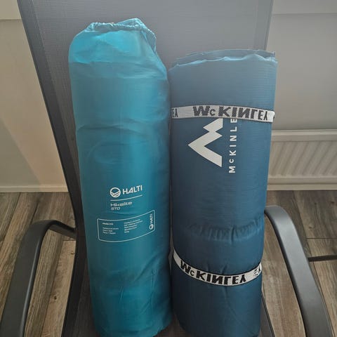 Kaksi kappaletta itsetäyttyvää Halti Hikelite Std - makuualustaa. Molemmat hyväkuntoisia, toki pientä tahraa ym. käytönjälkeä kahden partiolaisen jäljiltä löytyy. Ilma pysyy testatusti kummassakin.