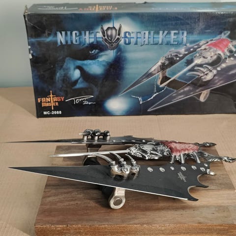 Myydään laadukas Kit Rae -suunnittelun fantasiatikari (United Cutlery). Terä 420J2-ruostumatonta, näyttävä koristekaiverrus ja pyöreät aukot. Sarvimainen väistin käärmeornamentein, suomu-kuvioitu kahva. Mukana alkuperäinen puinen seinäplakaatti (ripustusvalmiina).