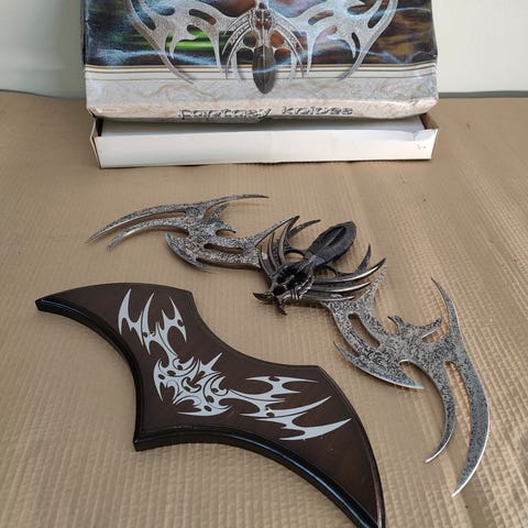Myydään näyttävä Master Cutlery -fantasiakynsiveitsi: useita kaartuvia teriä ja skorpioni-/alien-tyylinen runko. Mukana alkuperäinen laatikko ja suojasleeve. Hieno hyllykoriste tai rekvisiittaan. Koriste-esine, ei käyttötarkoitukseen.