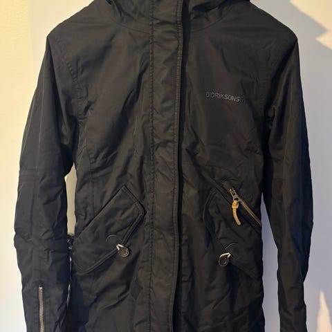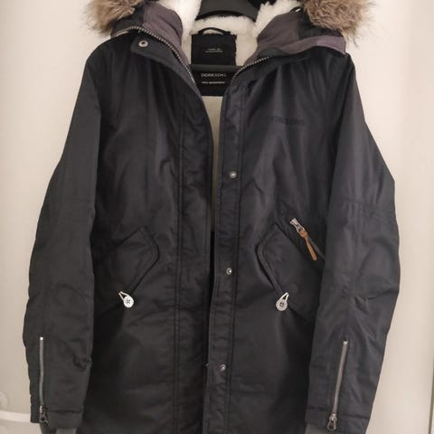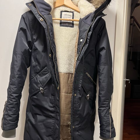Didriksons parka takki koko 36. Puoleen sääreen ulottuva malli. Lämmin vuori, pakkasillakin lämmin. Käytetty 2 talvea lähinnä ulkoilussa. Pesty.