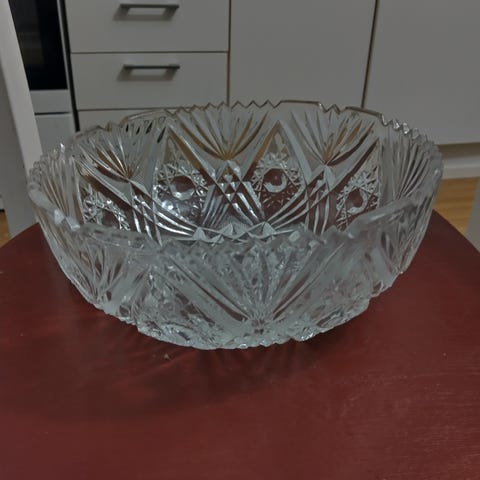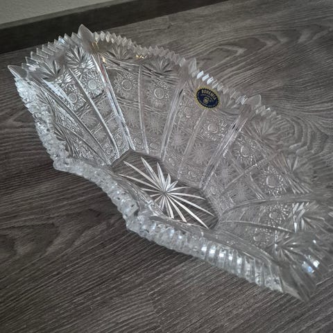 Kuvan mukainen ehjä ja siistikuntoinen kristallikulho. Korkeus 7 cm, sisähalkaisija n. 10,5 cm, kokonaishalkaisija n. 12 cm.