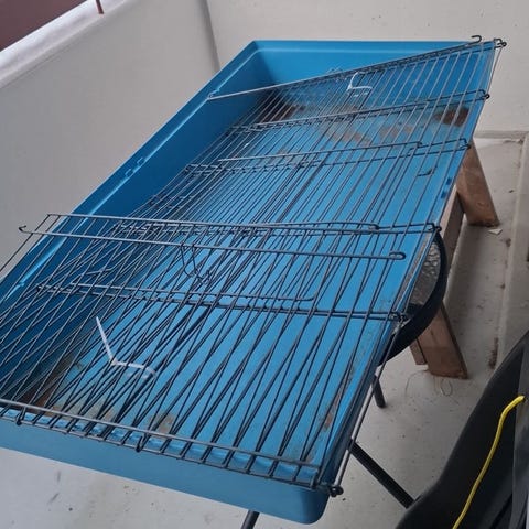 Myydään kanin häkki , juomapullo , kanin vessa-yhdessä kulmassa pieni halkeama , näkyy viimeisessä kuvassa , heinäteline , puinen mökki , myydään kaikki yhteishintaan 20 e , nouto