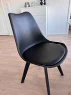 Tuolien istuinosat ovat keinonahkaa, runko on muovia ja jalat ovat puuta.