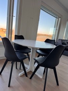 Ruokapöytä ja neljä tuolia hyvässä kunnossa.