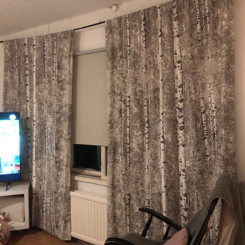 Olleet jonkin aikaa ikkunassa, en huomannut käytön jälkiä. Paksua materiaalia. Tehdasmittaiset valmisverhot.