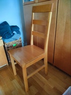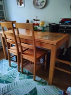 Tukeva, koivupuinen ruokapöytä ja viisi tukevaa tuolia. Yhdessä jälkeä, se on bonustuoli,