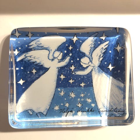 Iittalan 12cm korkea lasitaulu. Hyvä kunto, 2 pienen pientä naarmua oikeassa alakulmassa (kuva 2). Myös muita Heljän lasitauluja myynnissä.