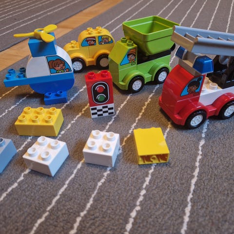 Lego Duplo ralliautot ja varikko