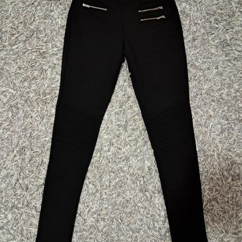 Hm mustat siistit leveälahkeiset housut, vähän paksumpaa kangasta. Koko 38, vastaa mielestäni S. Vyötärön sivussa vetoketju ja nappi.