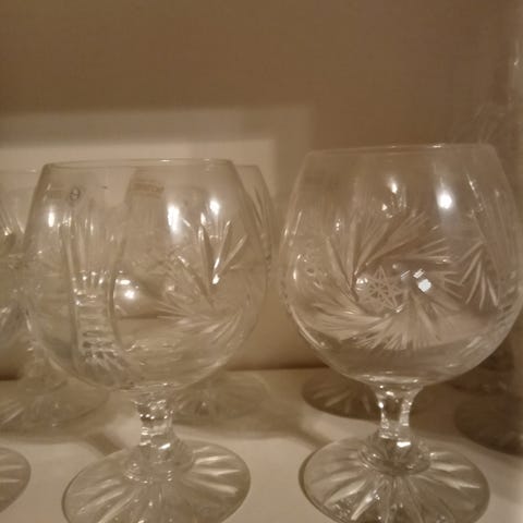 Vähäisellä käytöllä olevat ehyet konjakki kristallilasit. Korkeus 13 cm, suun halkaisija 7 cm. Ei naarmuja eikä säröjä. 6 kpl/60€