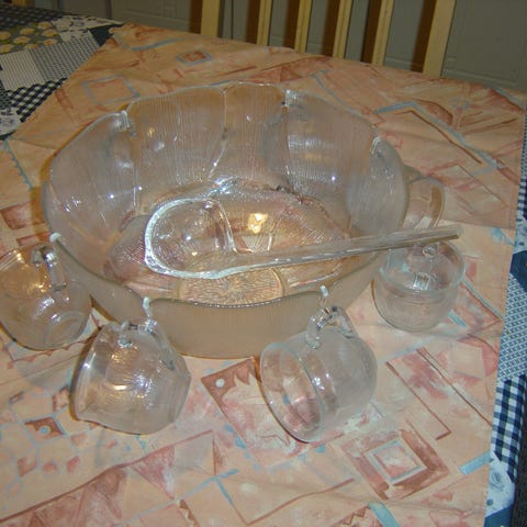 Hyväkuntoinen 12 hengen boolimalja setti, kauha ja pidikeet. Ei säröjä eikä kolhuja.