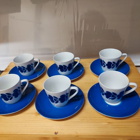 Arabia kahvikuppi ja lautanen, joissa on sininen kukkakuvio. Kuppi ja lautanen ovat posliinia. Sarja soveltuu kahvin tarjoiluun.