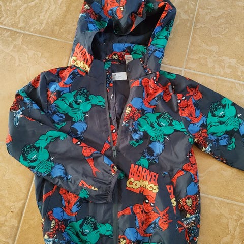 Marvel Lasten takki, koko 128, pojille. Takissa on pitkähihaiset hihat ja edessä vetoketju. Takissa on värikäs painatus Marvelin supersankariteemalla. Avangers.