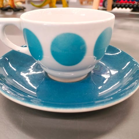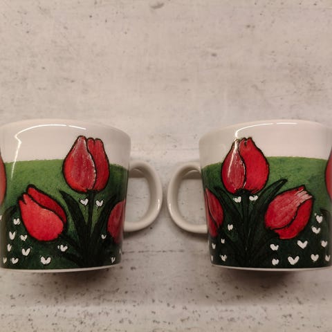 Viisi mollakuppia, viisi tulppaanikuppia, kaksi keltaista kuppia ja kuusitoista tassia.