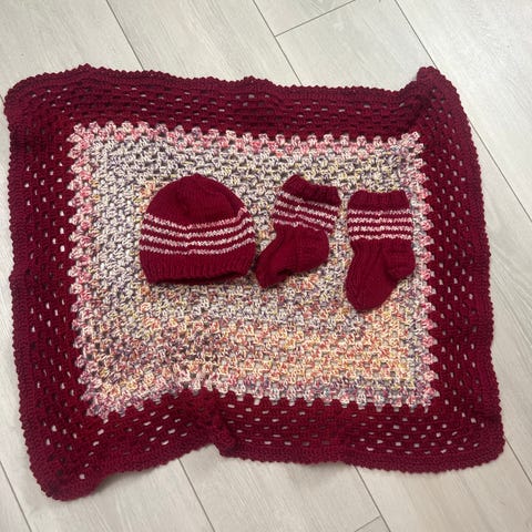 Itse neulotut, käyttämättömäksi jääneet, tumput, pipo ja sukat. Toisen sukan kantapäätä jouduttu vähän jälkikäteen kiristelemään. Käyttökelpoiset ja nätit kuitenkin.