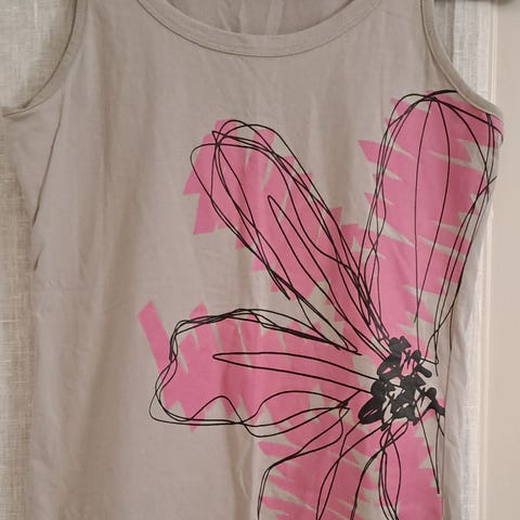 Vero Modan kaunis hihaton toppi, epäsymmetrinen kerroksellinen malli, koko S. Musta väri luonnonvaaleilla palloilla ja kevyt ilmava materiaali.