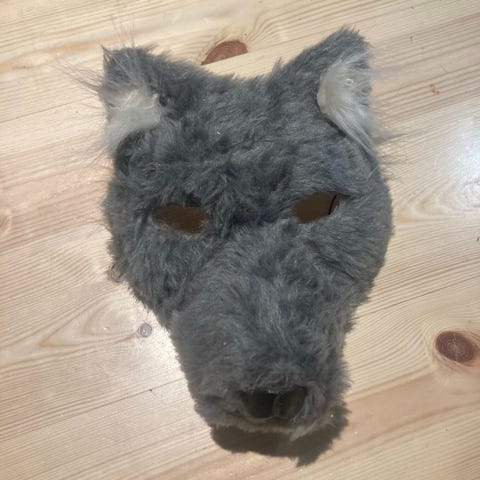 Lapsen tekemä hyvä kuntoinen ja laadukas koira-naamio, mukana häntä (Kiinnitys hakaneulalla) ja käsivarsiin puettavat käsineet. Maskin takana on joustava hihna jonka saa laitettua miellyttävästi pään ympärille.