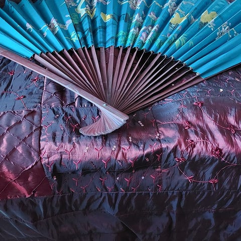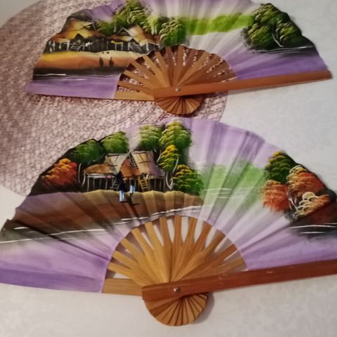 Japanilaishenkinen iso koristeviuhka seinälle. Bambu runko ja kurki & kirsikankukka (sakura) aiheinen maalattu kangas. Viuhkan on suuri, leveys 122cm & korkeus 75cm. kunto hyvä. ei taitettava