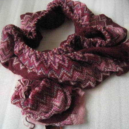 Käyttämätön viininpunainen/vaaleanpunasävyinen ” kierrehuivi”, kokoa : leveys 18 cm tai 40cm levitettynä, pituus noin 190 cm. 42% acrylic, 30% mohair ja 28% polyamidnylon.