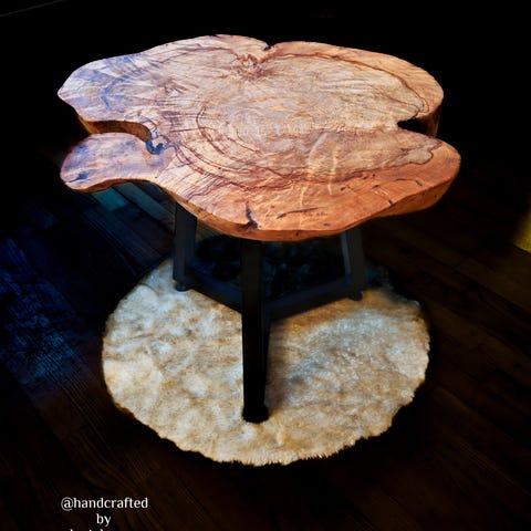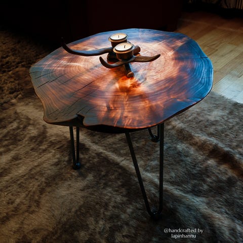 Pöytä tehty Koivunpahkasta, jossa mustat pinnijalat. Pinta käsitelty rubio monocoat chocolate ja Red velvet öljyvahalla.
