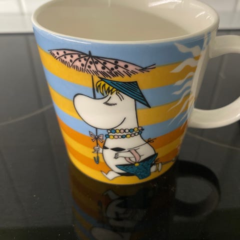 Hyväkuntoinen harvinaisempi muumimuki. Muutamia harmaita kulumajälkiä eri puolilla mukia. Katso myös muut myynnissä olevat muumimukini.