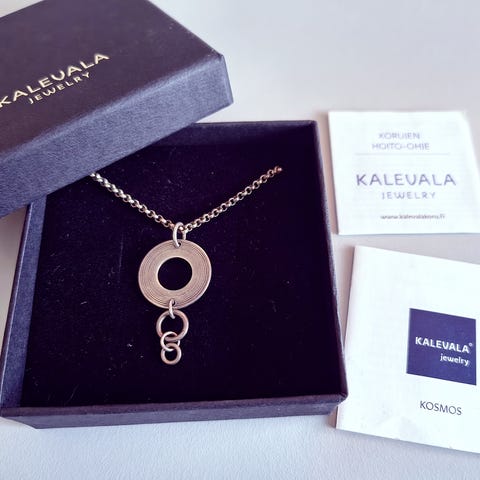Kalevala Kosmos -kaulakoru alkuperäisessä pakkauksessa. Mukana hoito-ohjeet ja Kosmos kaulakorun tarina. Koru on uusi ja käyttämätön, myös pakkaus virheetön.