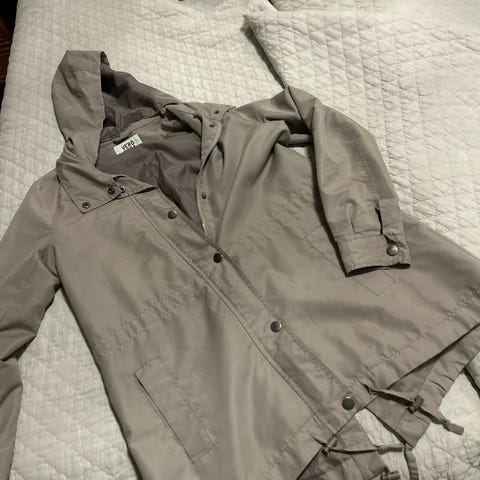 Vaalea hupullinen välikausitakki ulkoiluun. Reilun kokoinen. Kestää tihkusadetta. Pieniä käytönjälkiä löytyy, mutta yleisilme on siisti. Myyn koska on liian pieni itselle.