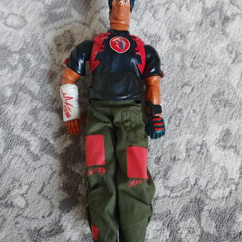 Action Man lelufiguuri, jossa on vihreä kypärä, sininen takki, keltaiset housut ja lumilauta. Figuurilla on kädessään ase. Sopii lasten leikkeihin ja keräilyyn.