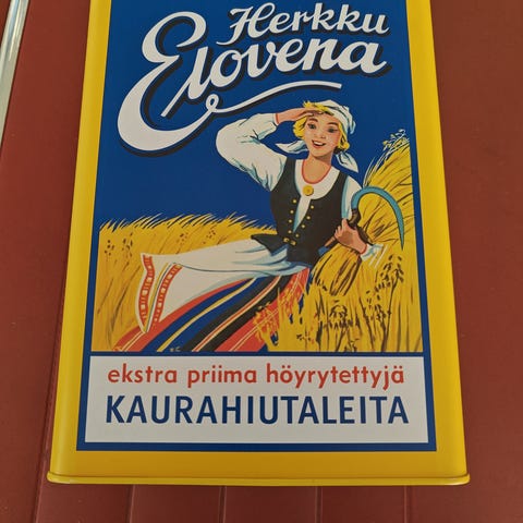 Myydään siistissä kunnossa oleva Elovena peltipurkki. On ollut käytössä, joten pientä käytön jälkeä voi löytyä.