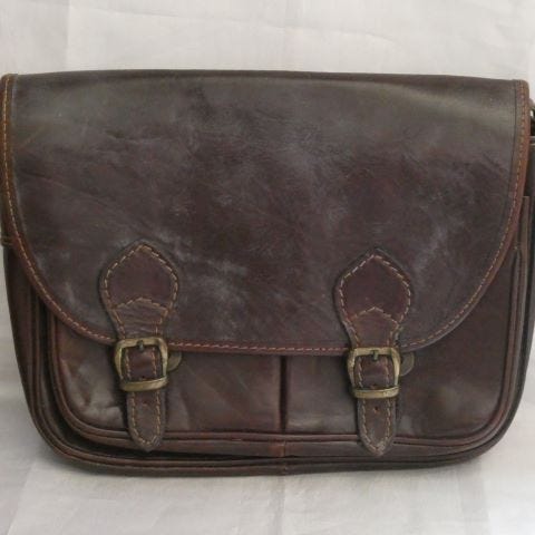 Nahkainen lähettilaukku. Käytetty ja patinoitunut, iästä ei tietoa.