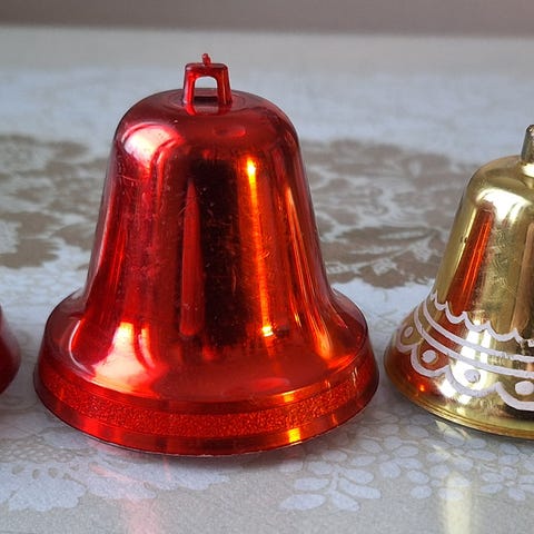 Vanhat metalliset joulukuusen kynttilöiden pidikkeet, kellot irrotettavia ja painavia (lyijyä?). Pidikkeiden korkeus n. 13 cm.