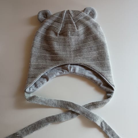 Vuoden 2022 äitiyspakkauksesta meleerattu vaaleanharmaa neulemyssy, jossa on nallenkorvat ja nauhat.
