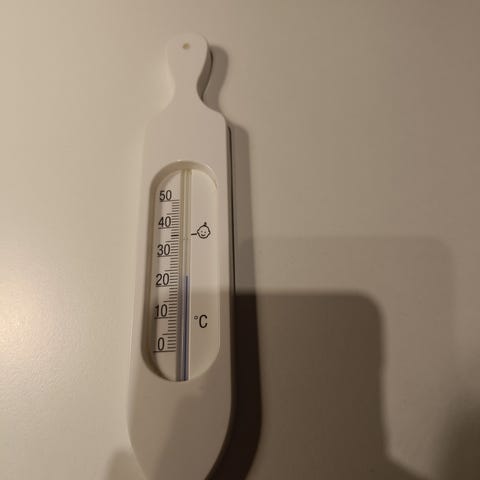 Lämpömittari kylpyveden lämpötilan mittaamiseen. Muoviosissa lommoa ja naarmua, mutta toimii.
