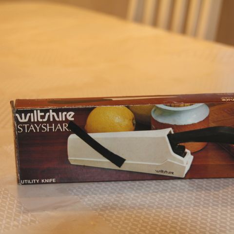 Mummon kaapista, 1970-1980 luvun joululahja jäänyt vielä pakettiin. Taatusti terävät. Paketti pituus 46,7 cm ja leveys 27,9 cm. Veitsi pisin 35,7 cm ja lyhin 17,8 cm.