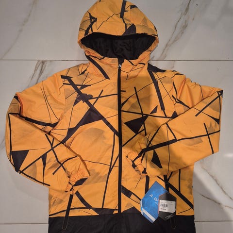Musta toppatakki mm. lasketteluun. Lumilukot hihansuissa ja vyötäröllä. Vetoketjutaskut edessä, hihassa, sisäpuolella povitasku. Vetoketjun saa avattua alhaalta ylös tai ylhäältä alas. Irrotettava huppu kadonnut.