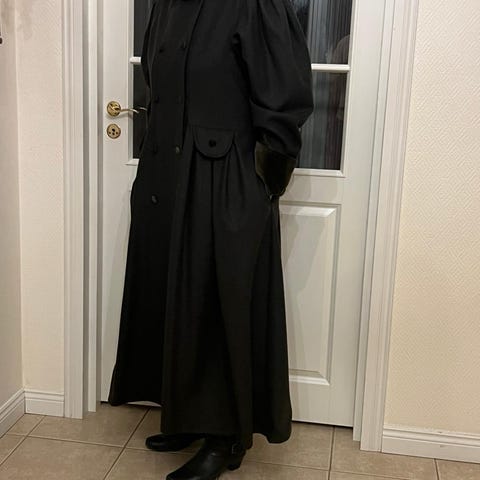 Naisten kotimainen, pitkä villakangastakki, väri tumma sammaleen vihreä