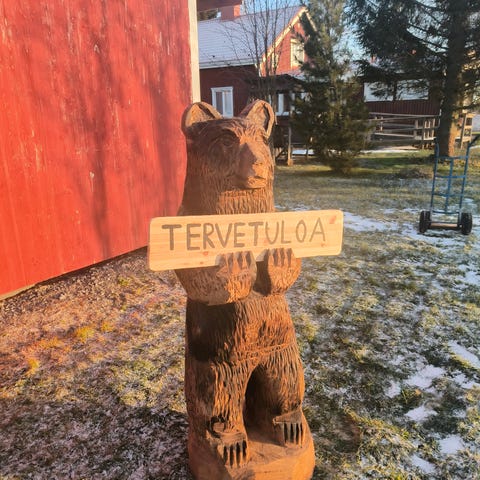 Puisveistos, jossa on karhu hahmona, joka pitää lyhtyä oksassa. Veistos on valmistettu puusta ja soveltuu sisä- tai ulkokäyttöön koriste-esineeksi.