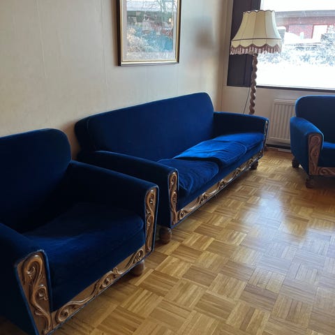 Myydään kaunis ja tukeva puinen sohvaryhmä, johon kuuluu: