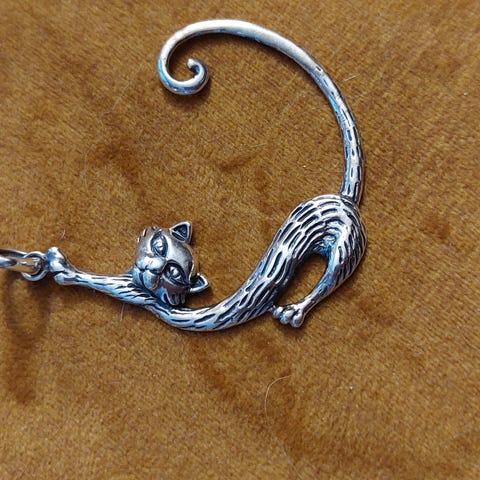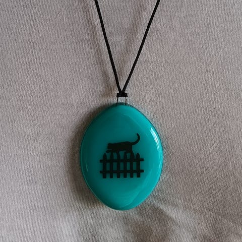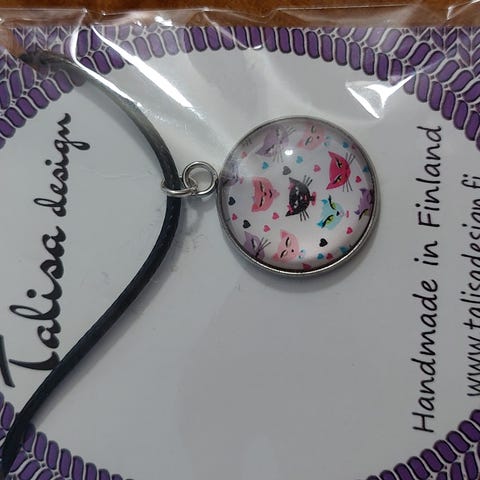 Vaaleanpunainen. Musta kissa. Musta nauha. Lasia. Itse suunniteltu ja käsityönä valmistettu.