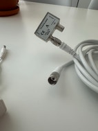 Mukana kaikki tarvittava: modeemi, virtakaapeli, TV-datakaton adapteri sekä nettipiuha (kaapeliyhteyden johto).