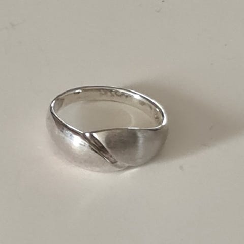 Georg Jensen Hopea sormus, valmistettu hopeasta. Sormus on unisex-mallinen ja siinä on yksinkertainen, leveä muotoilu, jossa koristeena pyöreitä hopeapalloja. Sormus sopii sekä miehille että naisille. Läpimitta on 1,6cm