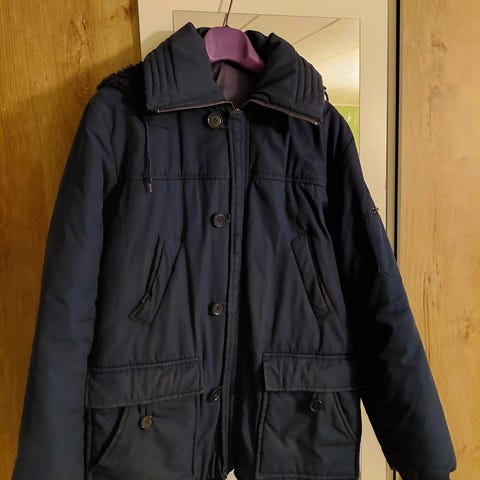 Musta miesten talvitakki. Takki hiukan nukkaantunut mutta muuten ehjä ja siisti