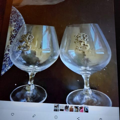 Konjakkilasit, 2 kappaletta. Lasit ovat kirkasta lasia, joissa on metallinen jalka ja koristeena vaakunat. Sopivat konjakin tai muiden väkevien juomien tarjoiluun.