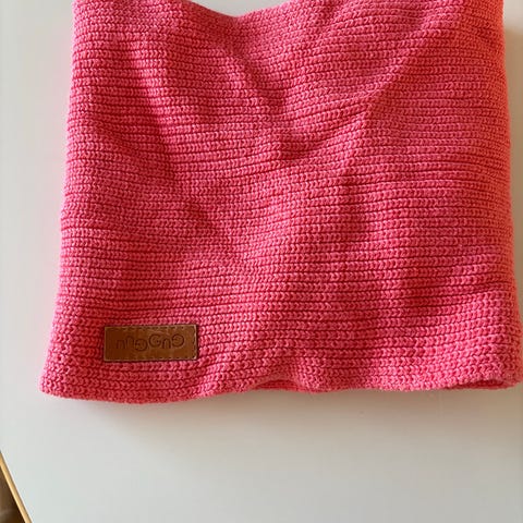 Gugguun tuubihuivi ja tumput persikat värisinä. Hyväkuntoiset käytetyt, tummentumaa.