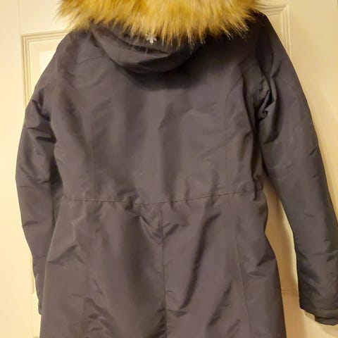Uudenveroinen puffer takki, täytteenä untuvaa, uudenveroinen. Toinen puoli musta, toinen beige, M. Alhaalla kiristysnyörit.