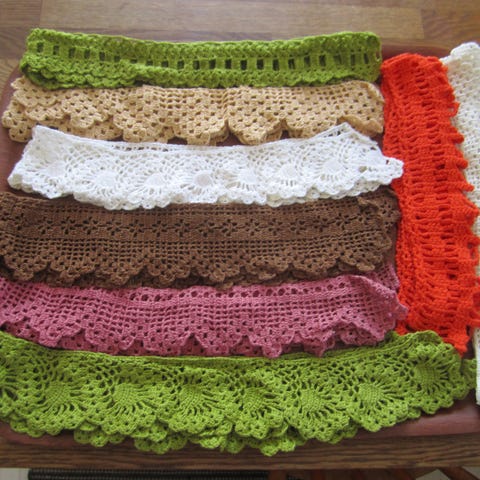 Tarjolla lila pyyhepari, pyyhkeiden päissä käsinvirkatut pitsit. Materiaali puuvillafrotee, koko 120 x 60 cm. Vanhat, mutta kunnossa. Värisävy hiukan vaaleampi kuin kuvissa.