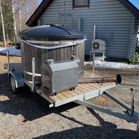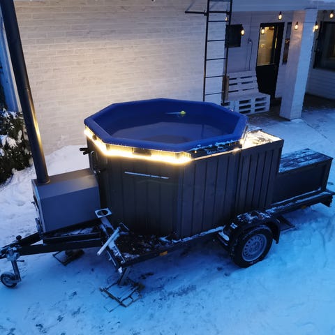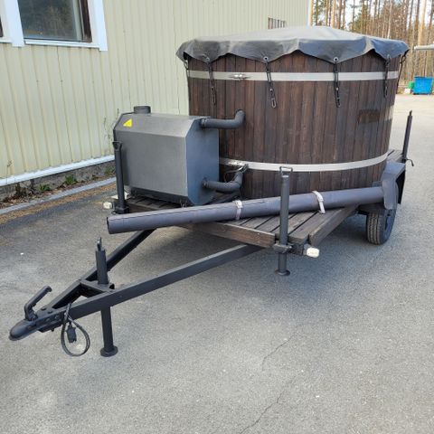 Myyntiin 8-kulmainen (6-8 hengelle) kärrypalju puulämmitteisellä kaminalla. JT-Motorsin valmistama.